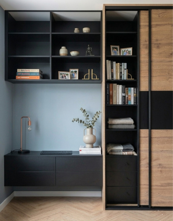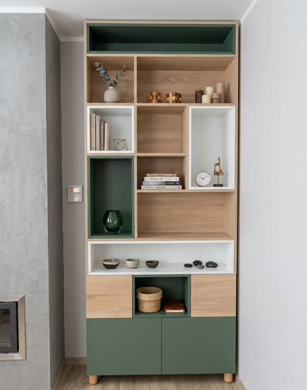Układ otwartych wnęk o różnych wielkościach pozwala na kreatywną ekspozycję dekoracji, książek czy pamiątek, tworząc dynamiczną, a zarazem uporządkowaną strukturę.
